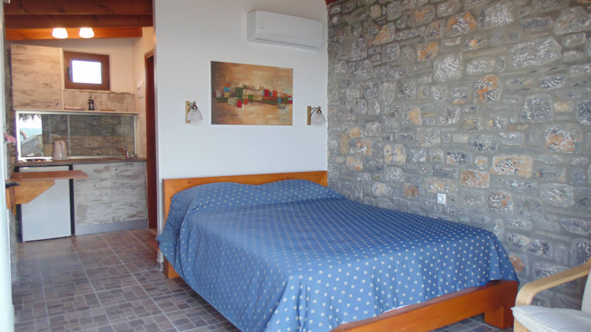 The 24sqm studios for two persons are located on the ground floor and each of them include a small kitchen, a bedroom, a WC with a shower, it's own air condition as well as a spacious veranda with a sea view as well as trees, sun beds and a fabulous pergola with a stone seat. The studio apartments are open-plan.