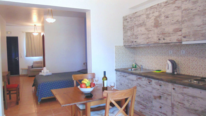 The apartments for 2-4 persons are on the first floor with the Rhodian style loft, thus two people can sleep on the comfortable mattress, while the other two can be accommodated on the lower level.