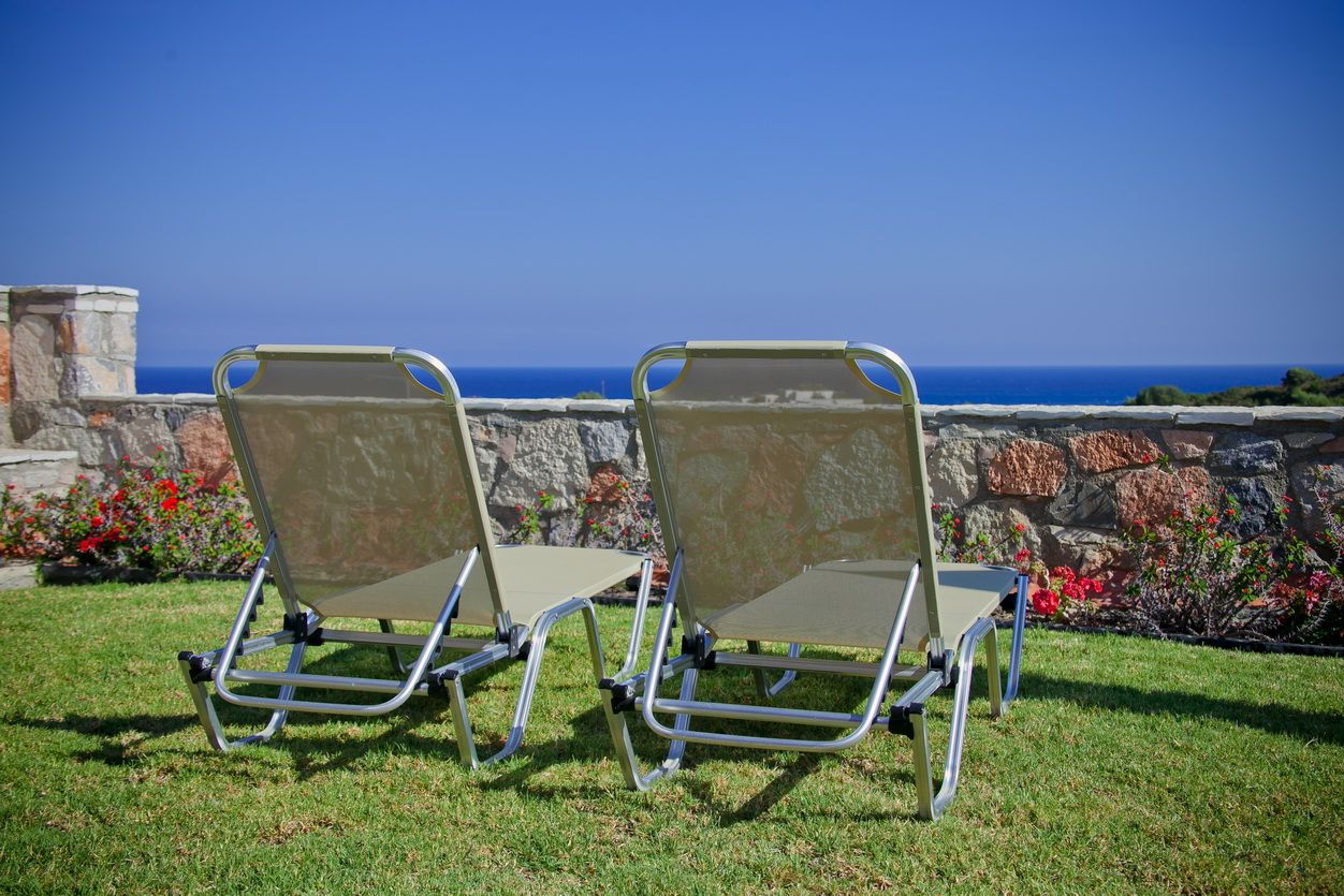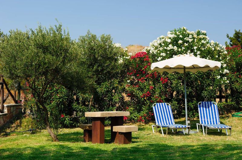 In it's garden, there is a private veranda with umbrella and sunbeds, viewing the deep blue sea.