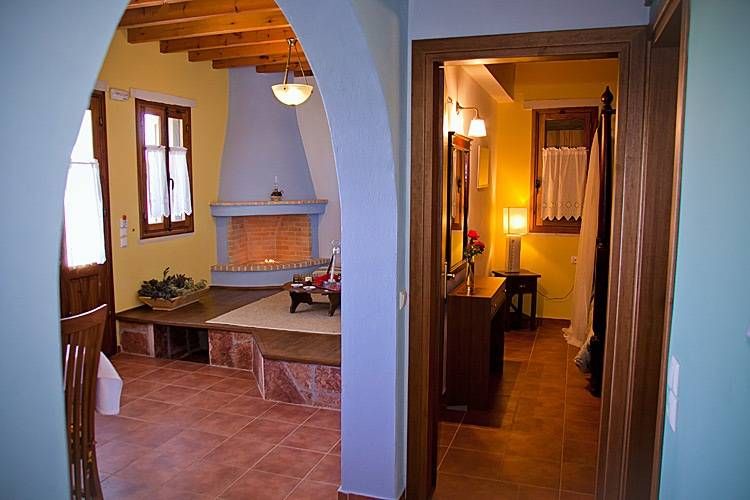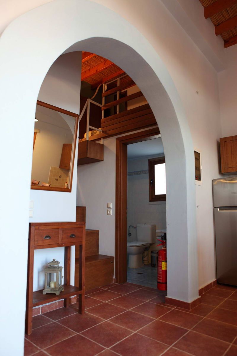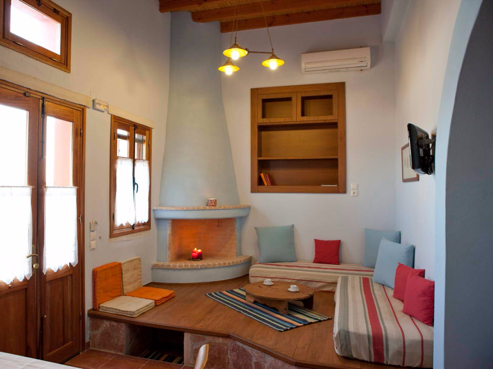 The Traditional sea view villa, consist of a bedroom with a Rhodian traditional-style sleeping double bed and another second sleeping area, with also semi-double mattress, that is located on the wooden loft. These villas are for 2-4 persons. The fourth person may also sleep separately in the living room on a sofa bed. A spacious kitchen with all necessary utensils and equipment and the dining room, all for a maximum capacity of 4 people, are part of the villas services. The dining room has a window providing you with view of the sea. Furthermore, there is a living room in a typical Rhodian style, with a fireplace for the winter months. Also there is a large bathroom with WC, bathtub mirror and hair dryer.